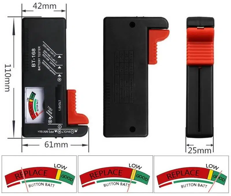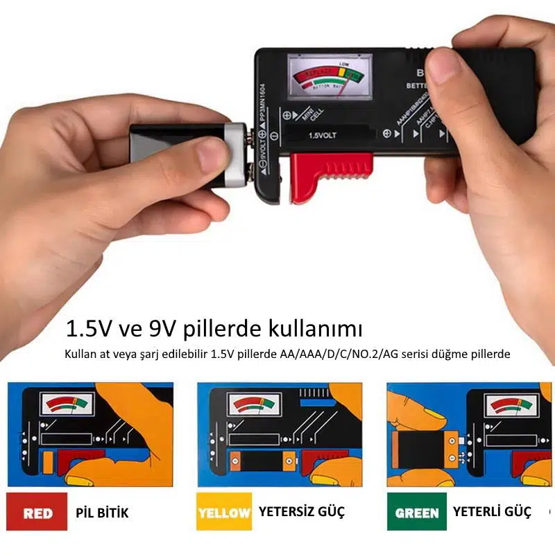 Tüm 1.5 V ve 9 V pillerin güç seviyesini kontrol eder
