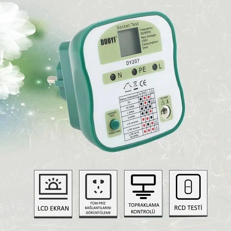 DUOYI DY207 Priz Topraklama Test Cihazı, prizlerin topraklama, faz ve nötr bağlantılarını hızlı ve güvenli şekilde test etmek için tasarlanmış pratik bir test cihazıdır. Elektrik ustaları, teknisyenler ve ev kullanıcıları için idealdir.