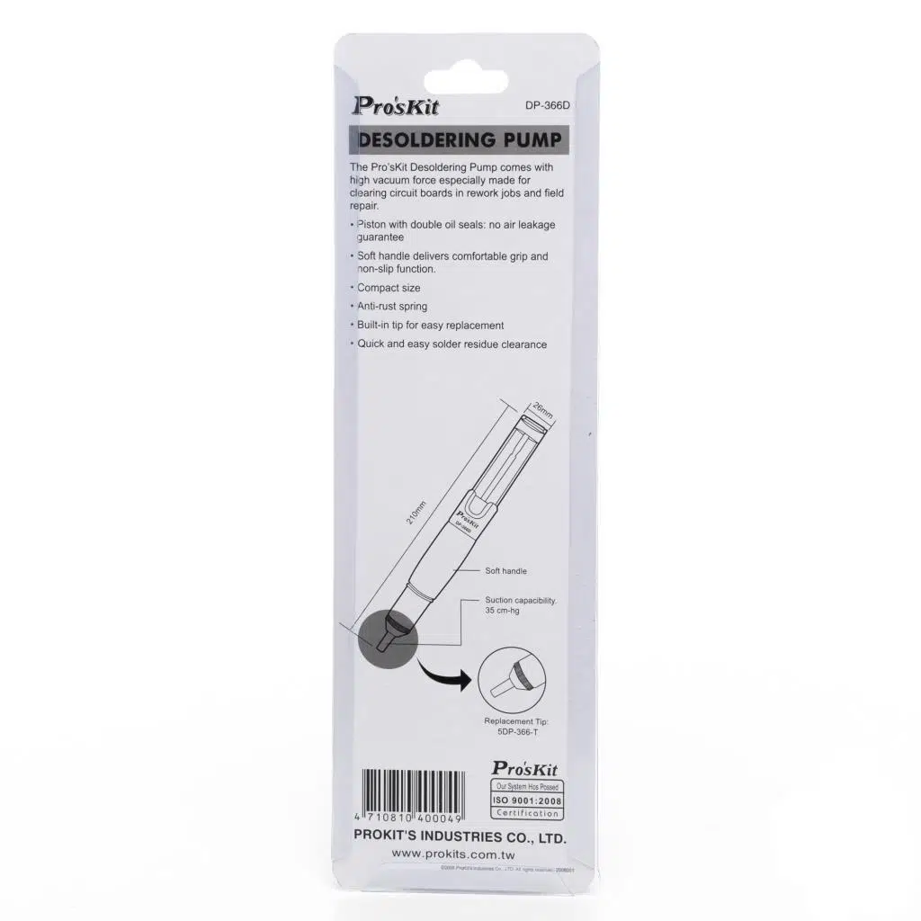 DP-366D lehim pompası Proskit tarafından geliştirilmiş her seviyede kullanıcıya hitap eden bir üründür. Lehim sökme işlerinde kullanabileceğiniz uzun ömürlü bir lehim pompasıdır. Yüksek emiş kapasitesiyle lehimleri kolay ve hızlı bir şekilde sökmenizi sağlar. Kolay kullanımı ve uygun fiyatıyla kullanıcı dostu bir üründür.