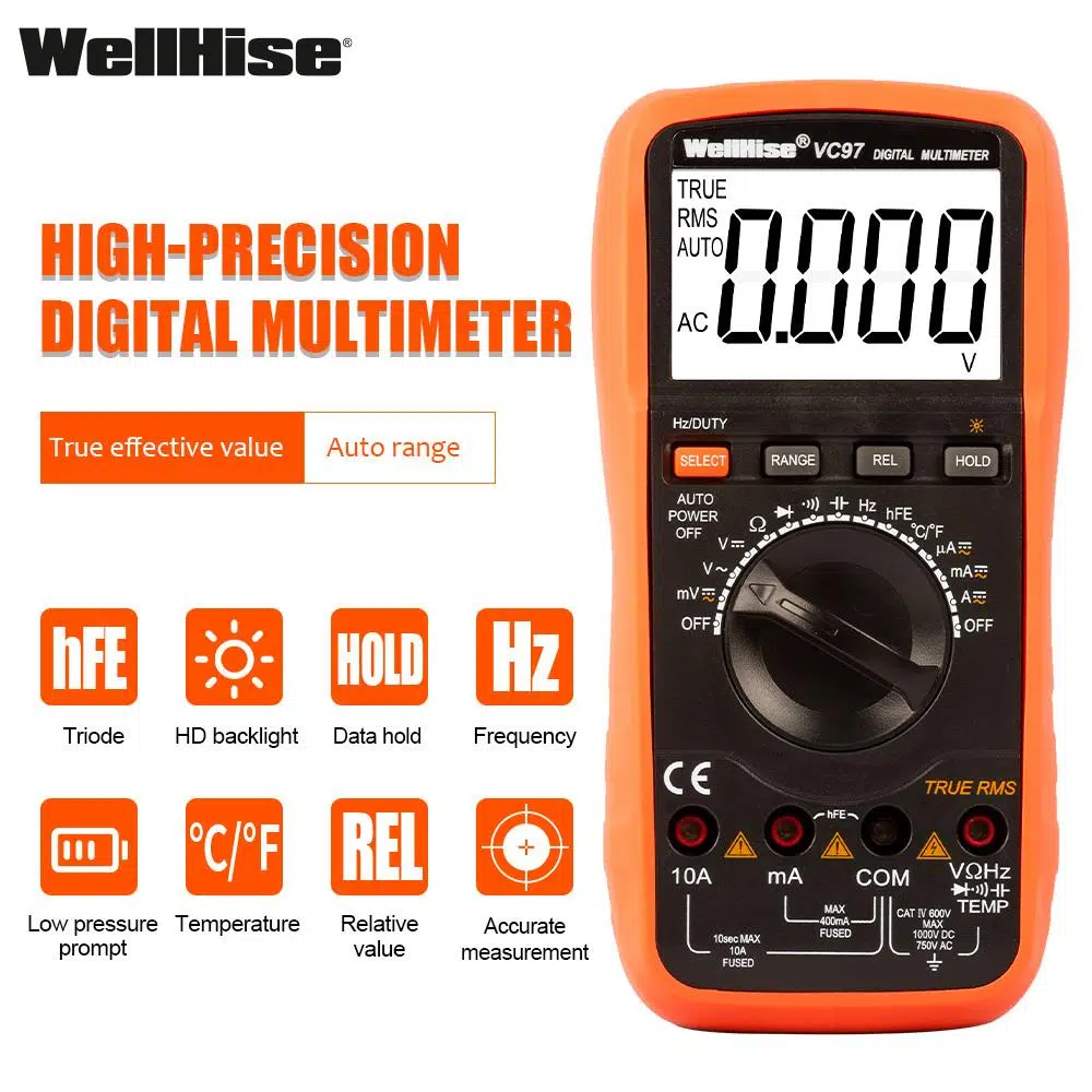 WellHise VC97 dijital multimetre 1000V DC voltaj ve 750V AC voltaj kapasitesine sahip hassas bir multimetre cihazıdır.